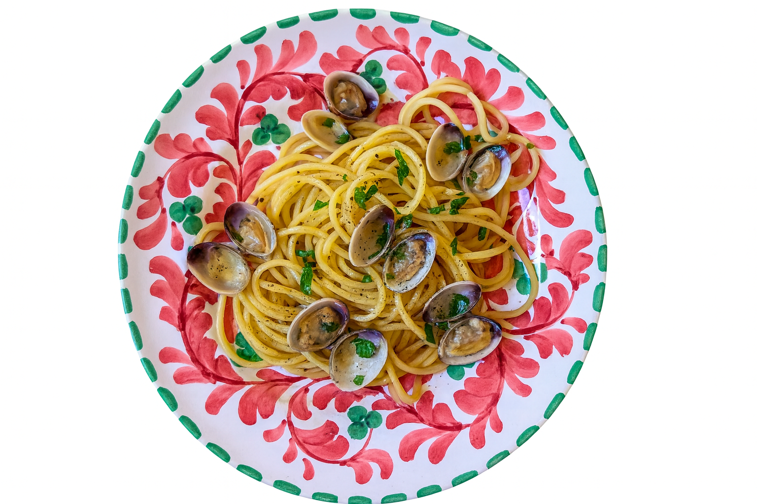 Dans une assiette à pâtes en céramique artisanale, le brillant des coquillages, l’or de la sauce et le vert du persil composent une présentation digne des trattorie napolitaines.